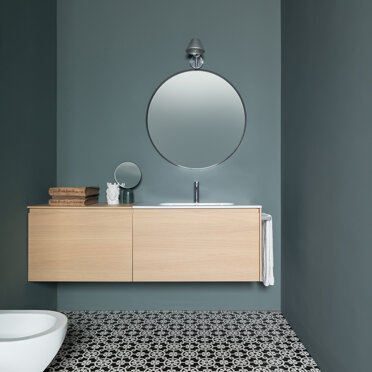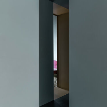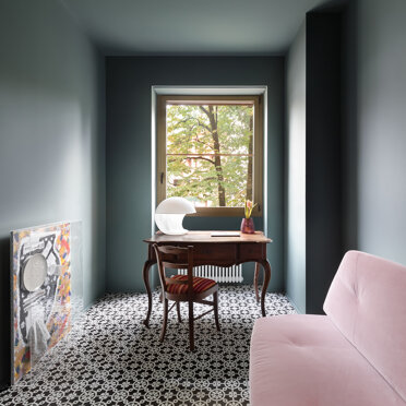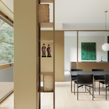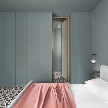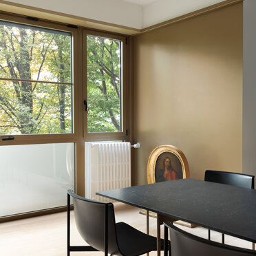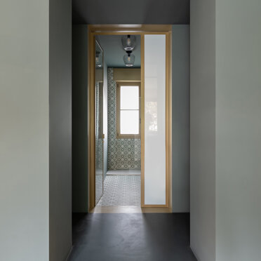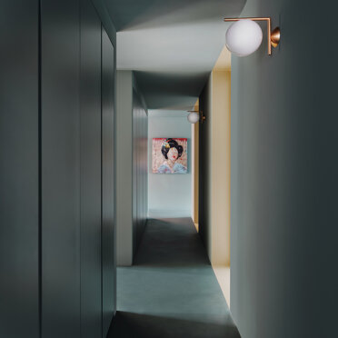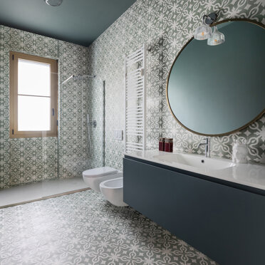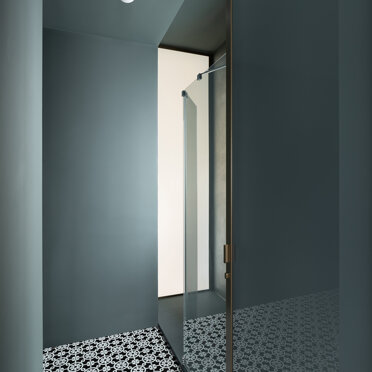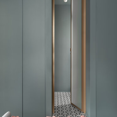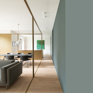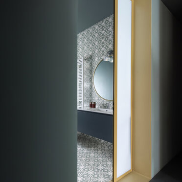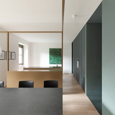 La zona giorno si caratterizza dalla presenza di materiali molto caldi, listoni di parquet in rovere naturale e alluminio anodizzato, contrastata da una quinta color verde foresta che scandisce i passaggi e i tagli di luce accogliendo disimpegno, servizi e zona notte. Apparentemente più fredda, si accende negli imbotti e nelle vetrate riprendendo il calore dorato dell’alluminio anodizzato ‘fil rouge’ dell‘intero progetto. Mentre, nelle camere e nei bagni, dialoga nell’utilizzo di cementine classiche dal motivo arabeggiante.