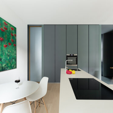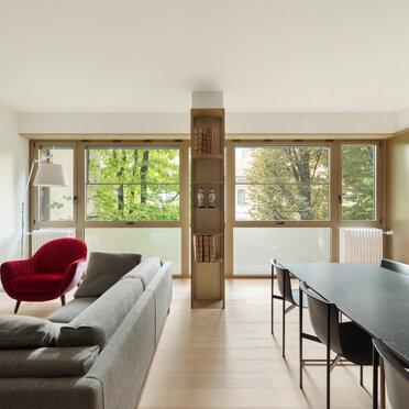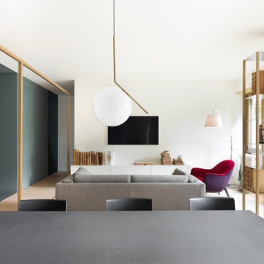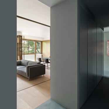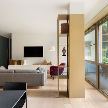 L’intervento ha interessato un appartamento di 140 mq, non lontano dal centro storico di Monza, dall’impianto originale tipico degli anni 70/80 caratterizzato dalla presenza in facciata di una vetrata cielo terra, comune a tutto l‘edificio. La forte frammentazione degli spazi rispetto all’ampia metratura ha richiesto un intervento volto a ripensare radicalmente la zona giorno, resa un open space, attraverso la creazione di un soggiorno ampio in comunicazione diretta con la zona pranzo e cucina.