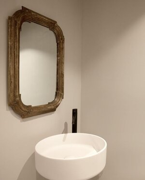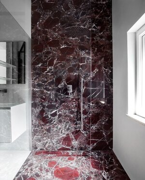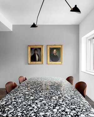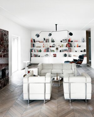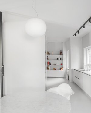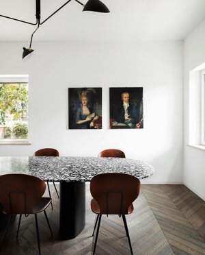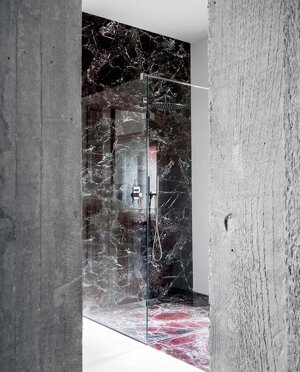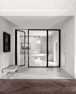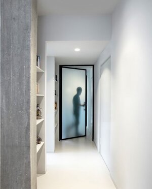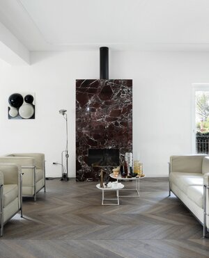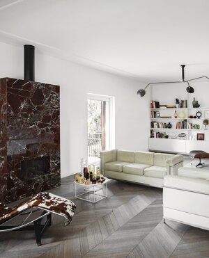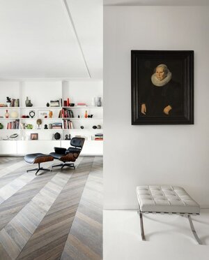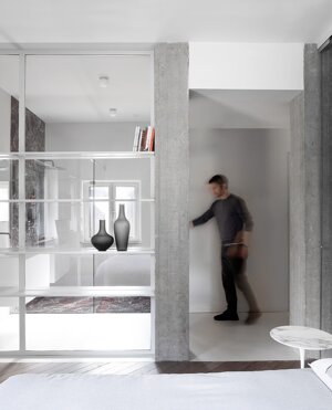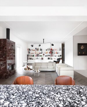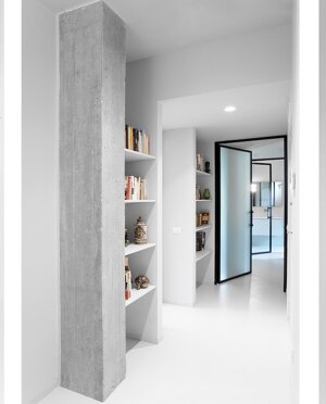 Uno stile sì minimalista, ma con tratti materici profondamenti riconoscibili. Ferro, legno, cemento e marmo si miscelano, suggerendo ora un sapore classico, ora uno contemporaneo. L’appartamento si snoda attorno ad un asse centrale ideale e privo di confini fisici che divide gli ambienti di rappresentanza da quelli di servizio. Il soggiorno, fulcro vitale del progetto, evoca un gusto classico, reinterpretando, con gli occhi di oggi, il parquet a spina ed il marmo rosso levanto del camino. Pensato per accogliere icone del design, dialoga, attraverso una vetrata in ferro, con la cangiante cucina monomaterica, incentivando l’incontro degli abitanti. In un’architettura dall’identità essenziale che strizza l’occhio al passato, una nota “stonata” (o sfumata), inserita appositamente per impreziosire il progetto, è nel recupero di oggetti antichi o semplicemente vecchi (ritratti, sedie, cornici), grazie alla feconda collaborazione con “oh my lab”, che riesce a donare essenza vintage a dettagli apparentemente privati dal tempo di significato.