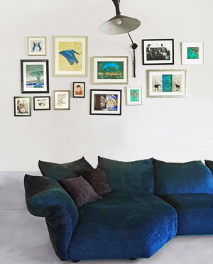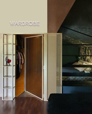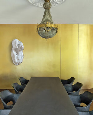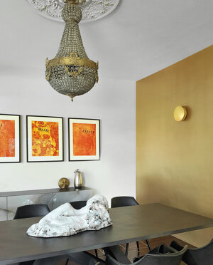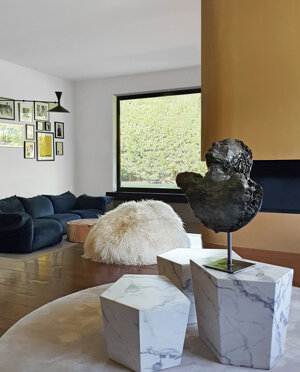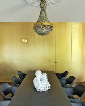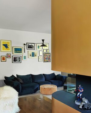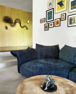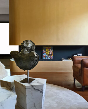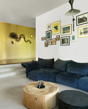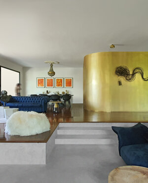 Il progetto d’interni mantiene inalterata la conformazione della villa originale, puntando ad accogliere e valorizzare collezioni di arredi ed opere d’arte. Il soggiorno, fulcro vitale del progetto, si caratterizza per l’istallazione di volumi dorati che, articolano lo spazio, fungendo da pareti attrezzate e quinte espositive. Ferro, legno, cemento e oro si miscelano, suggerendo ora un sapore classico, ora uno contemporaneo. Gli arredi di design, tra cui il divano Standard di Edra, i Tavolini da Caffè di Riva, la Madia Metropol di Cattelan o la lampe de Marseille di Le Corbusier, le sculture in resina NARCOTICA e APNESYA dell’artista Roberta Morzetti, le opere dell’artista finlandese Karin Bjorklund, la scultura in fil di ferro di Oscar Roberto Aciar e i complementi di arredo contribuiscono ad accentuare la connotazione eclettica del progetto.